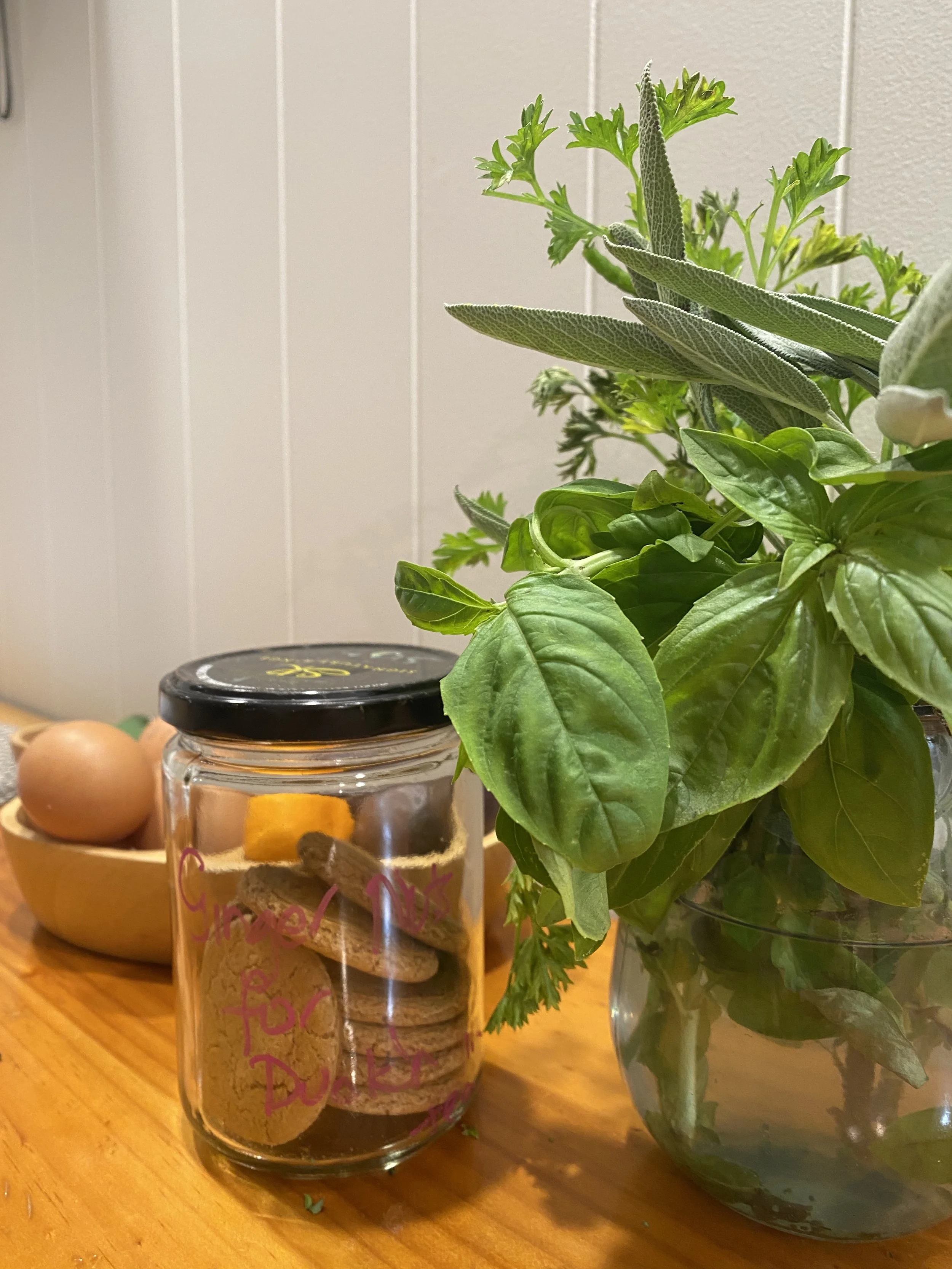 Coffee machine and accompanying obligatory Chocolate Fish, assorted teas and milk of your preference